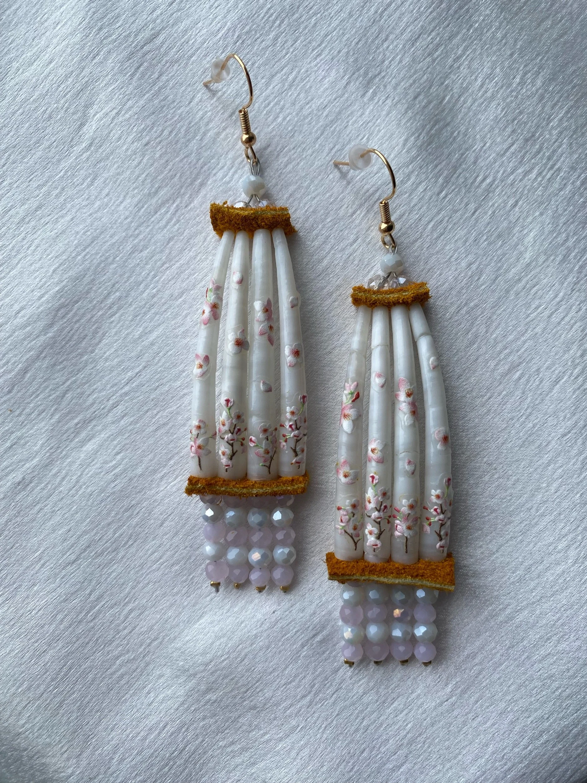 Emma & Elijah’s Work › E&E’s Pink Floral Dentalium Earrings Image 1 of 2 Image 2 of 2 E&E’s Pink Floral Dentalium Earrings $115.00 3.5-4 inches long 0.75-1 inch wideGold findings 4mm preciosa crystal beads Dentalium Hide Wire Purchase Added! 3.5-4 inches long 0.75-1 inch wideGold findings 4mm preciosa crystal beads Dentalium Hide Wire