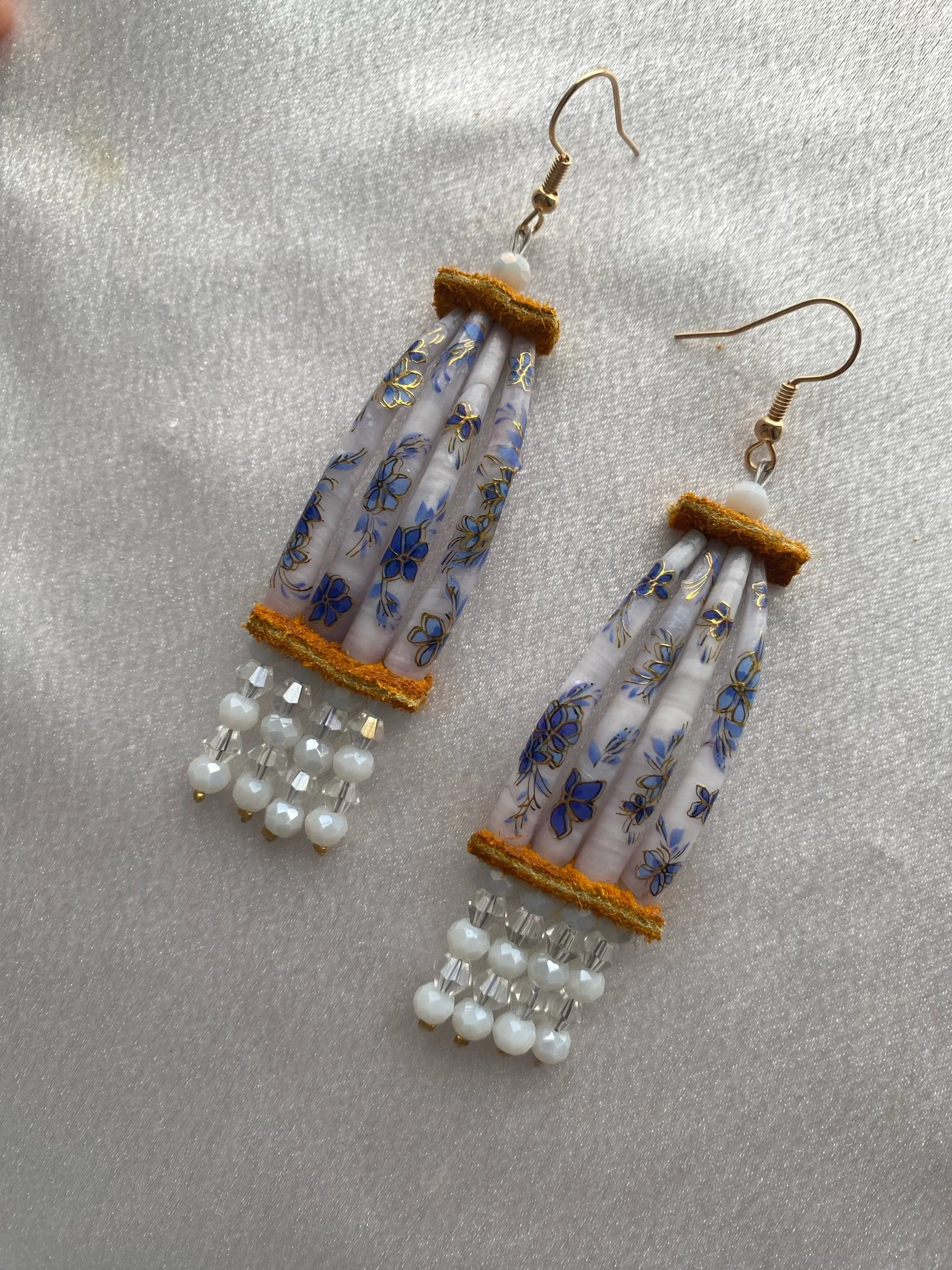 Emma & Elijah’s Work › E&E’s Periwinkle Floral Dentalium Earrings Image 1 of 2 Image 2 of 2 E&E’s Periwinkle Floral Dentalium Earrings $115.00 3.5 inches long 0.75-1 inch wideGold findings 4mm preciosa crystal beads Dentalium Hide Wire Purchase Added! 3.5 inches long 0.75-1 inch wideGold findings 4mm preciosa crystal beads Dentalium Hide Wire