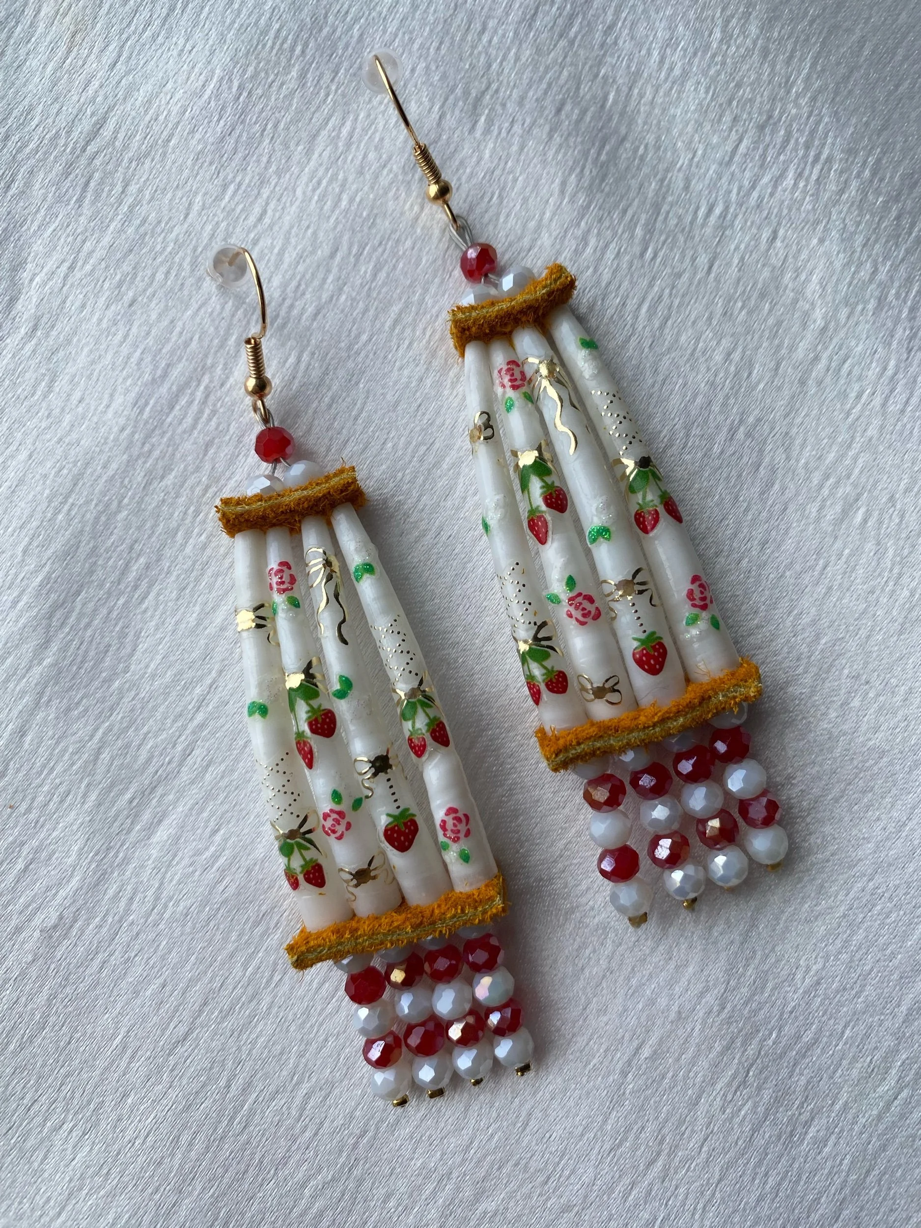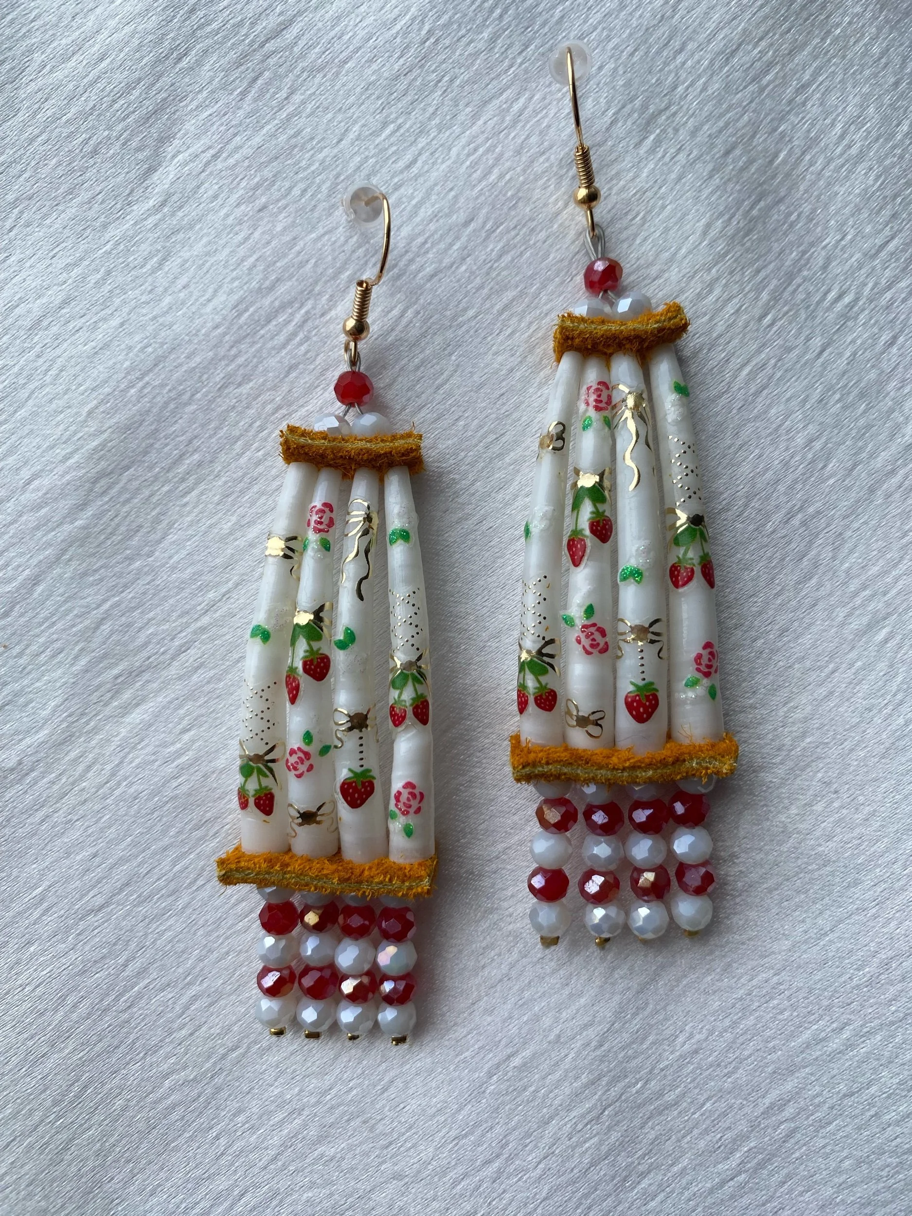 Emma & Elijah’s Work › E&E’s Strawberry Dentalium Earrings Image 1 of 2 Image 2 of 2 E&E’s Strawberry Dentalium Earrings $115.00 sold out 3.75-4 inches long 0.75-1 inch wideGold findings 4mm preciosa crystal beads Dentalium Hide Wire Sold Out Added! 3.75-4 inches long 0.75-1 inch wideGold findings 4mm preciosa crystal beads Dentalium Hide Wire