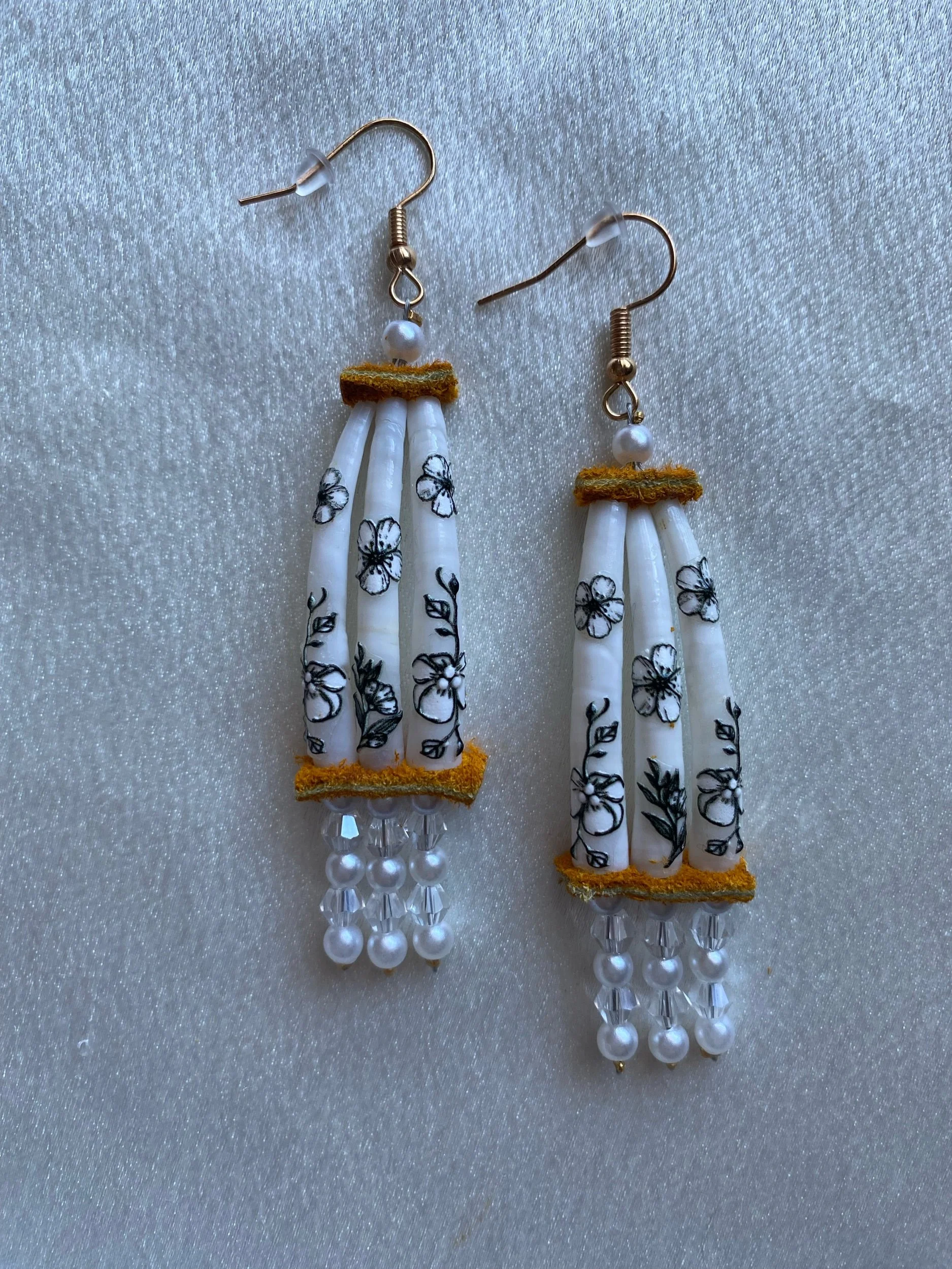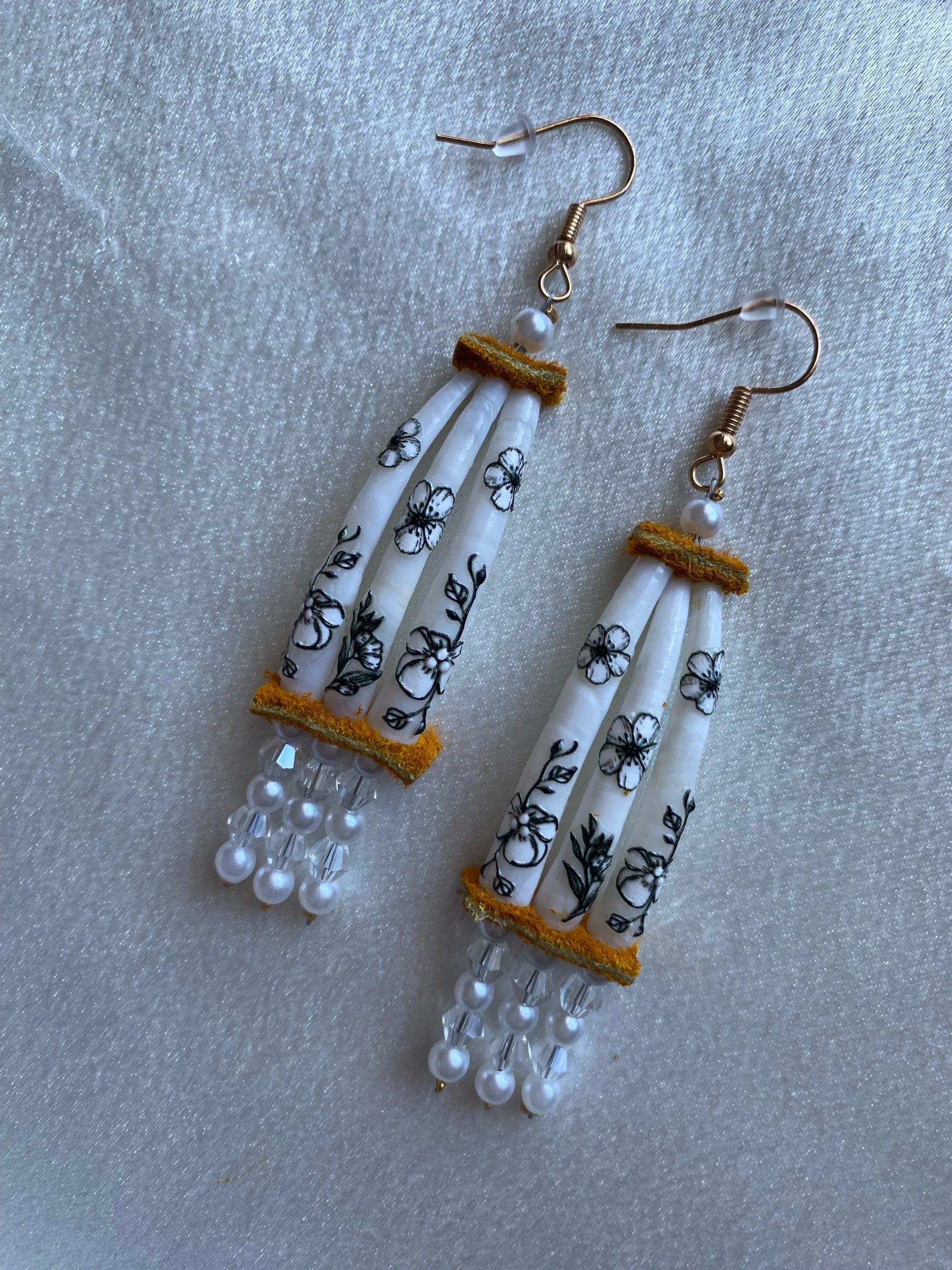 Emma & Elijah’s Work › E&E’s Black & White Floral Dentalium Earrings Image 1 of 2 Image 2 of 2 E&E’s Black & White Floral Dentalium Earrings $100.00 3.25 inches long 0.75 inch wideGold findings 4mm preciosa crystal beads Dentalium Hide Wire Purchase Added! 3.25 inches long 0.75 inch wideGold findings 4mm preciosa crystal beads Dentalium Hide Wire