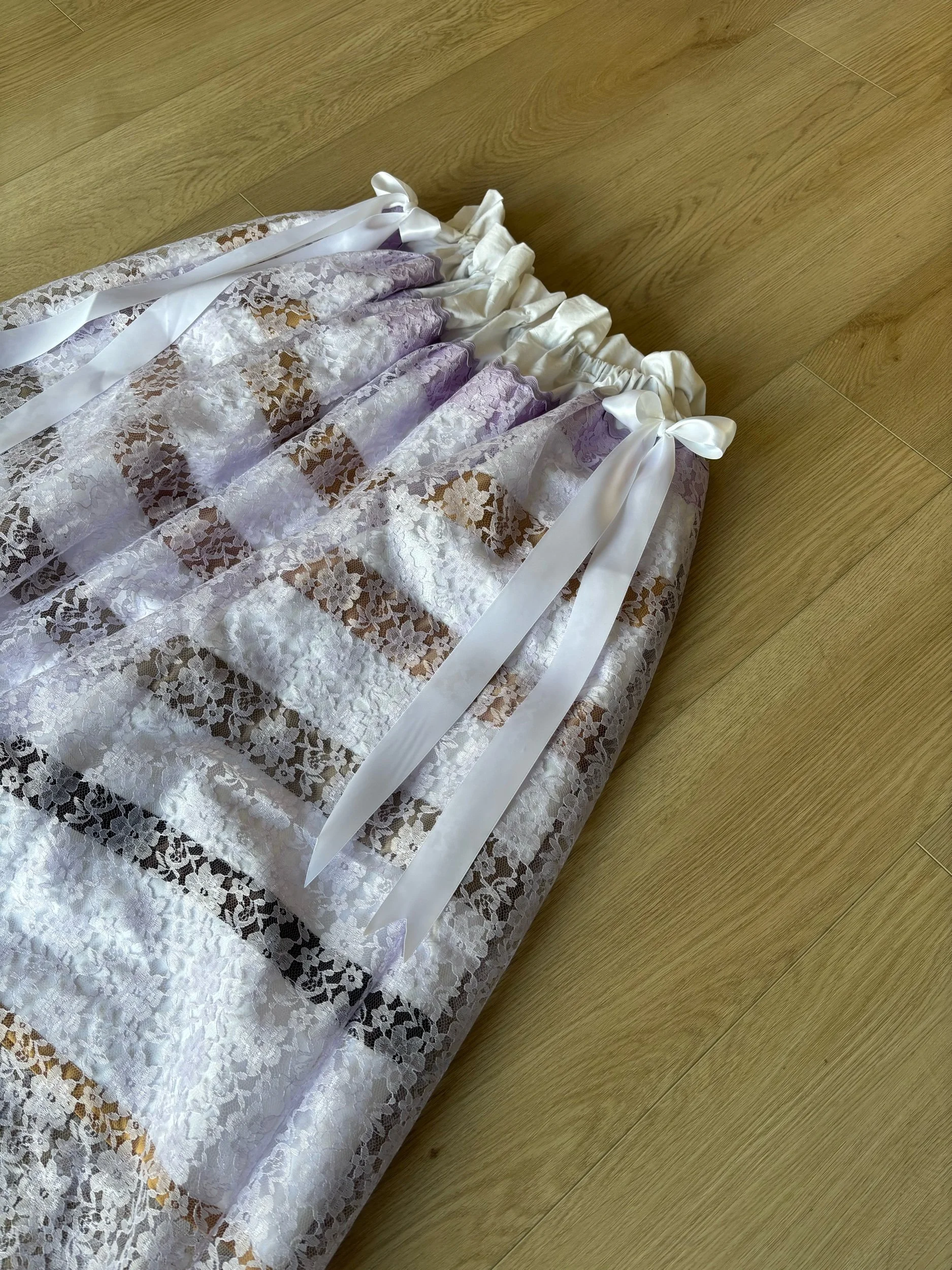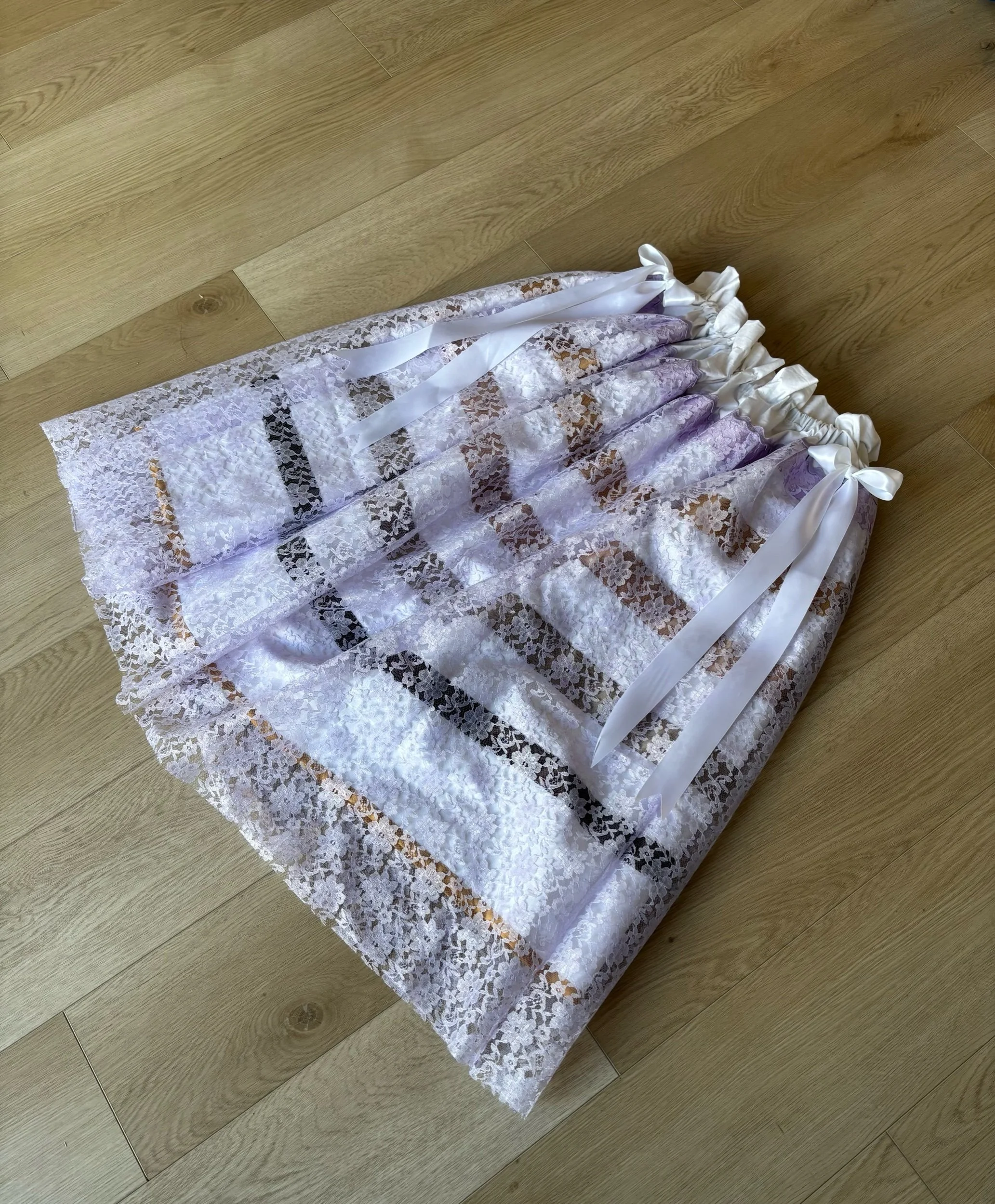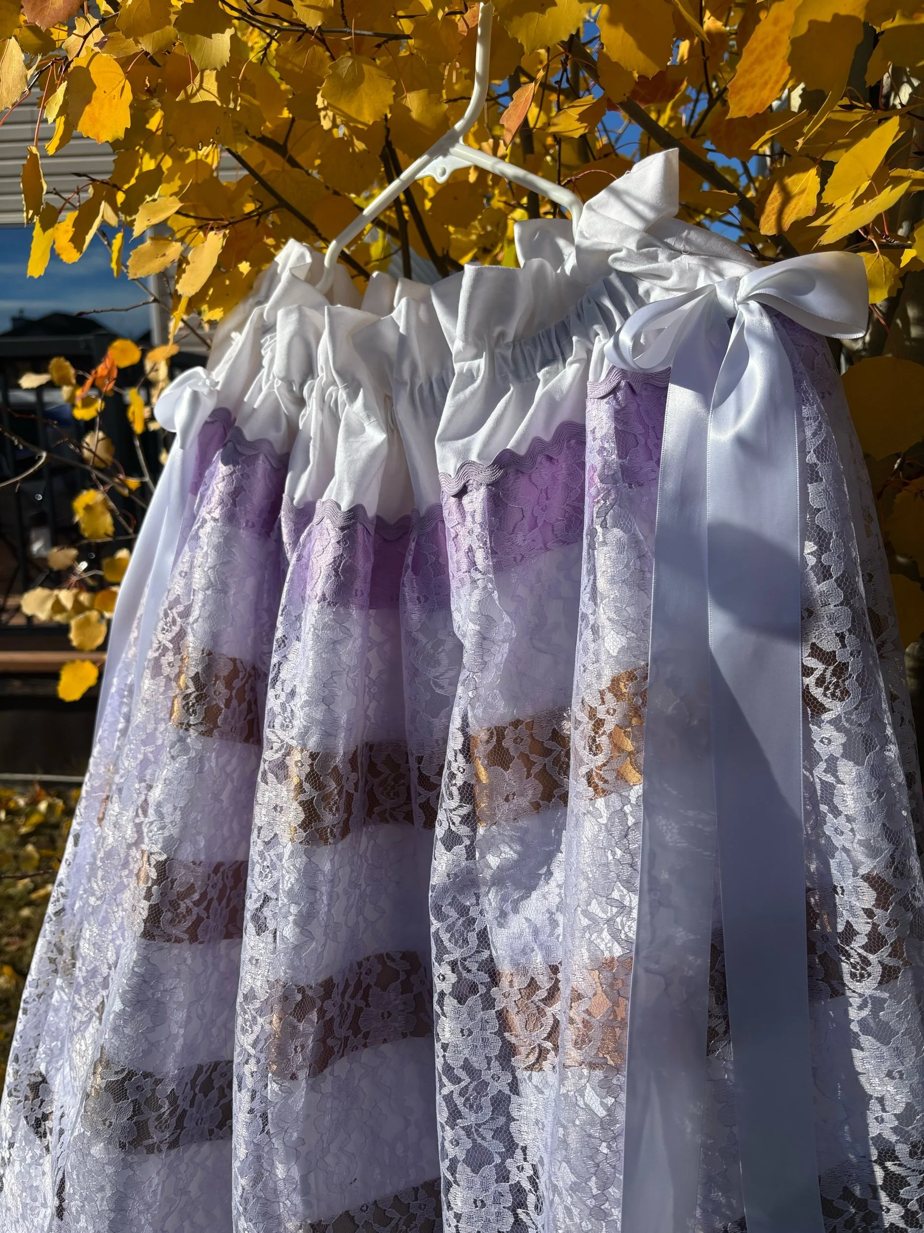 Lakota's Work › Lakota’s Pastel Ribbon Skirt Image 1 of 4 Image 2 of 4 Image 3 of 4 Image 4 of 4 Lakota’s Pastel Ribbon Skirt $275.00 •Purple lace overlayBows on either sideFits Medium - 2X31.5” skirt length35” lace length Purchase Added! •Purple lace overlayBows on either sideFits Medium - 2X31.5” skirt length35” lace length