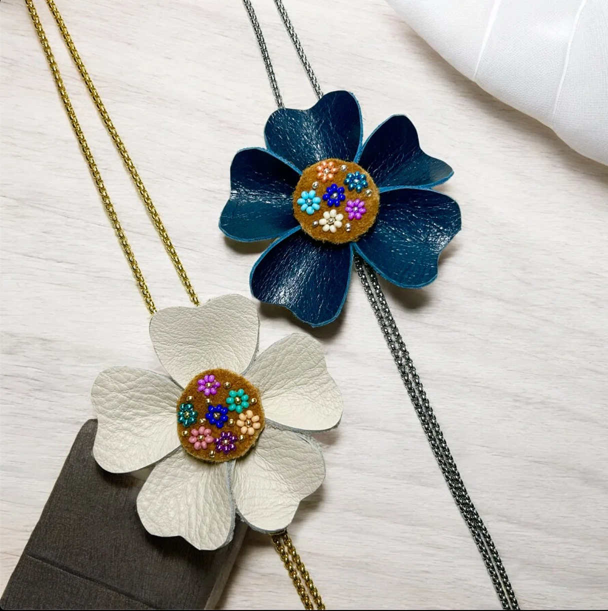 These leather flower bolo ties feature brightly beaded floral accents on traditional smoked moose hide surrounded by high quality leather petals. Bone and Navy colour available.